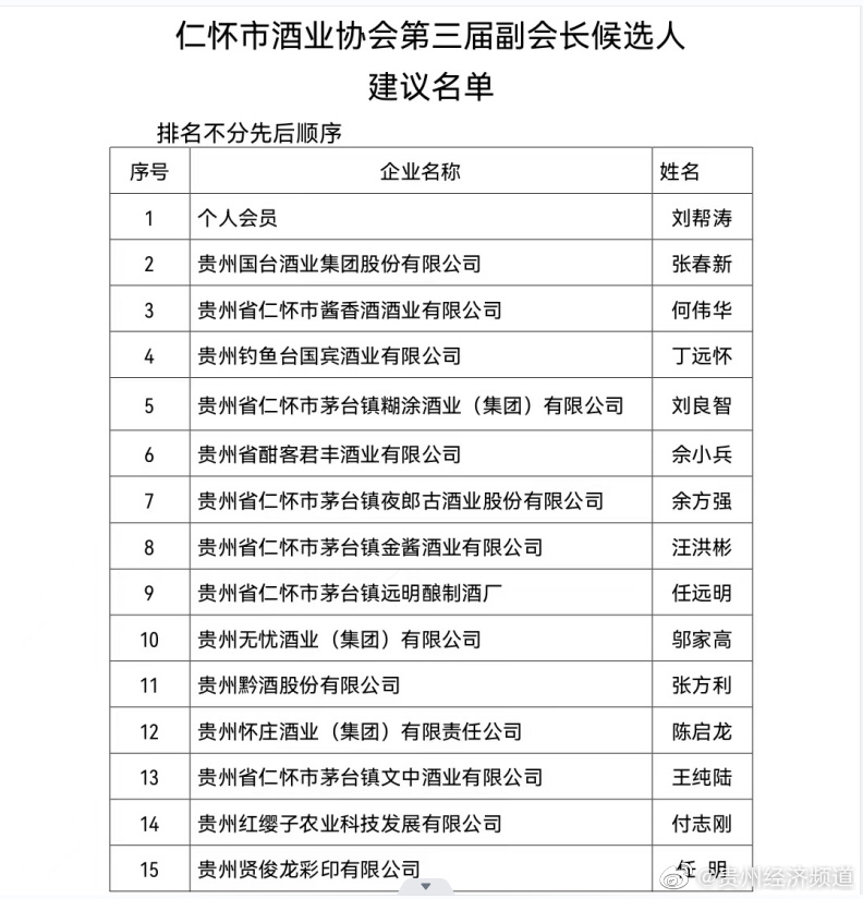 经过无记名投票选举,仁怀市酒业协会第三届理事会成员诞生:吕云怀连任会长,刘帮涛当选常务副会长兼秘书长,国台酒业张春新、仁怀酱香酒酒业何伟华、钓鱼台酒业丁远怀、糊涂酒业刘良智、酣客君丰酒业佘小兵、夜郎古酒业余方强、金酱酒业汪洪彬、远明酒业任远明、无忧酒业邬家高、黔酒股份张方利、怀庄酒业陈启龙、文中酒业王纯陆、红缨子农业付志刚、贤俊龙彩印任明当选副会长;此外,青年商会会长唐晖当选仁怀市酒业协会第三届监事会监事长。