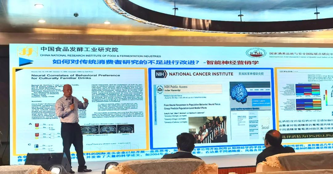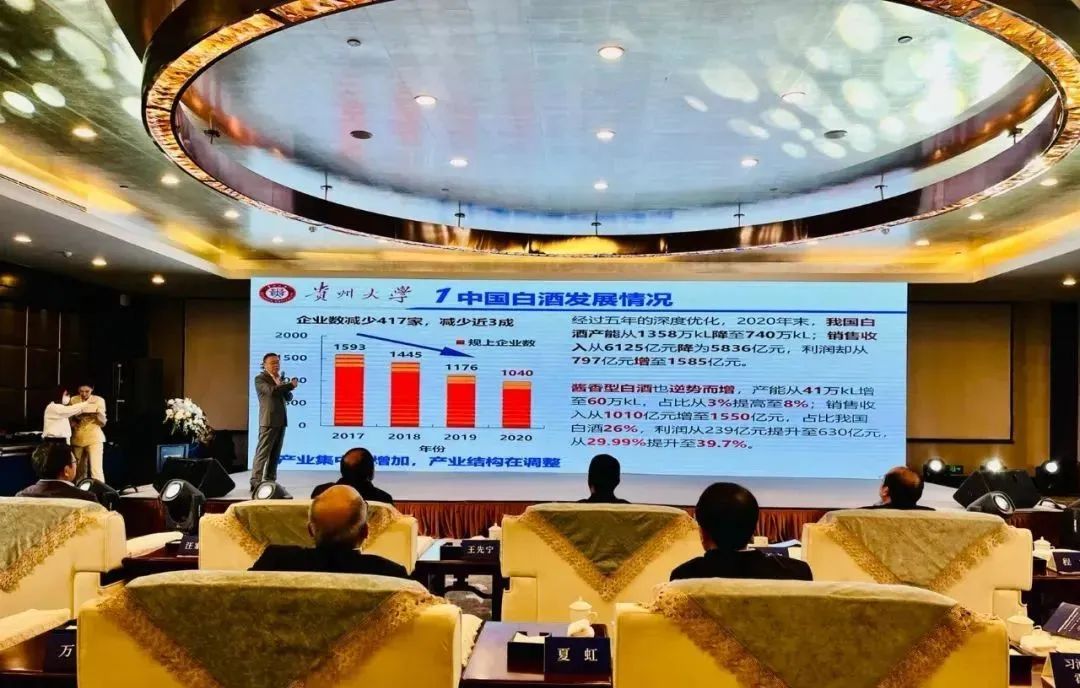 贵州大学酿酒工程与食品工程学院院长邱树毅在演讲中列举了有关酱香型白酒产业发展的各项数据,阐述了贵州酱酒各阶段的发展情况,并从酱香型白酒产区特征、生产工艺、产品标准、品质与食品安全、技术研发方面发表了自己的见解。