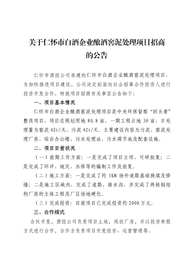 关于仁怀市白酒企业酿酒窖泥处理项目招商的公告