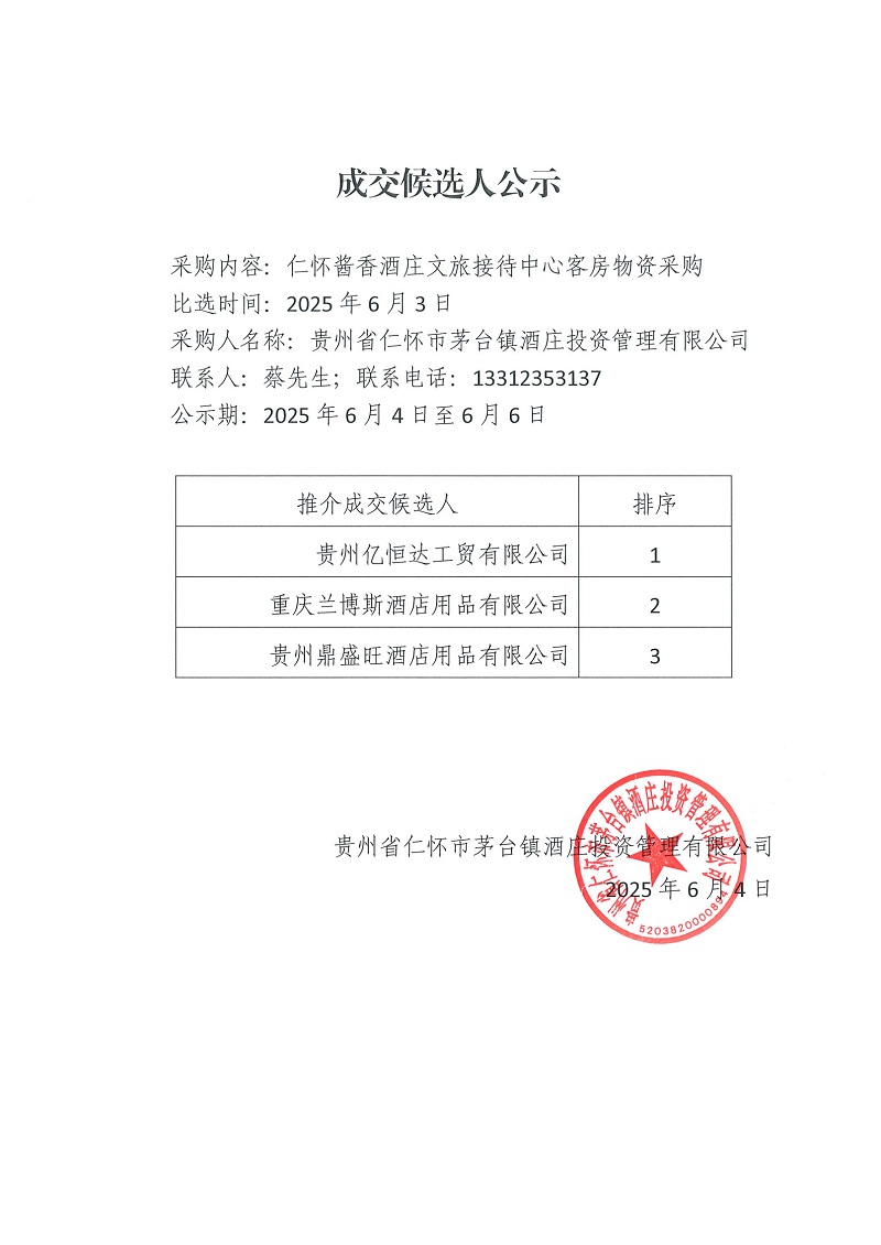 成交候选人公示(客房物资)
