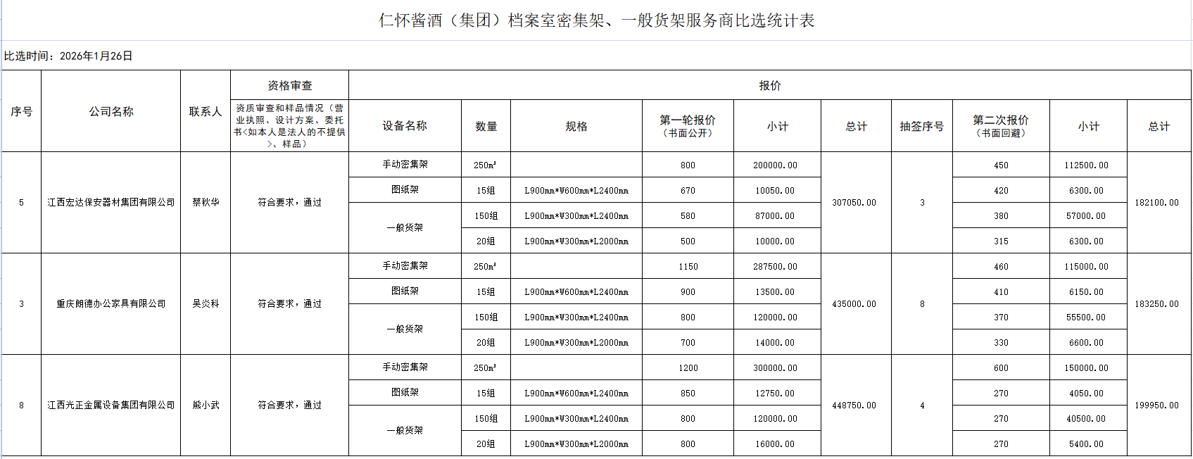 仁怀酱酒(集团)档案室密集架、一般货架服务商比选情况公示